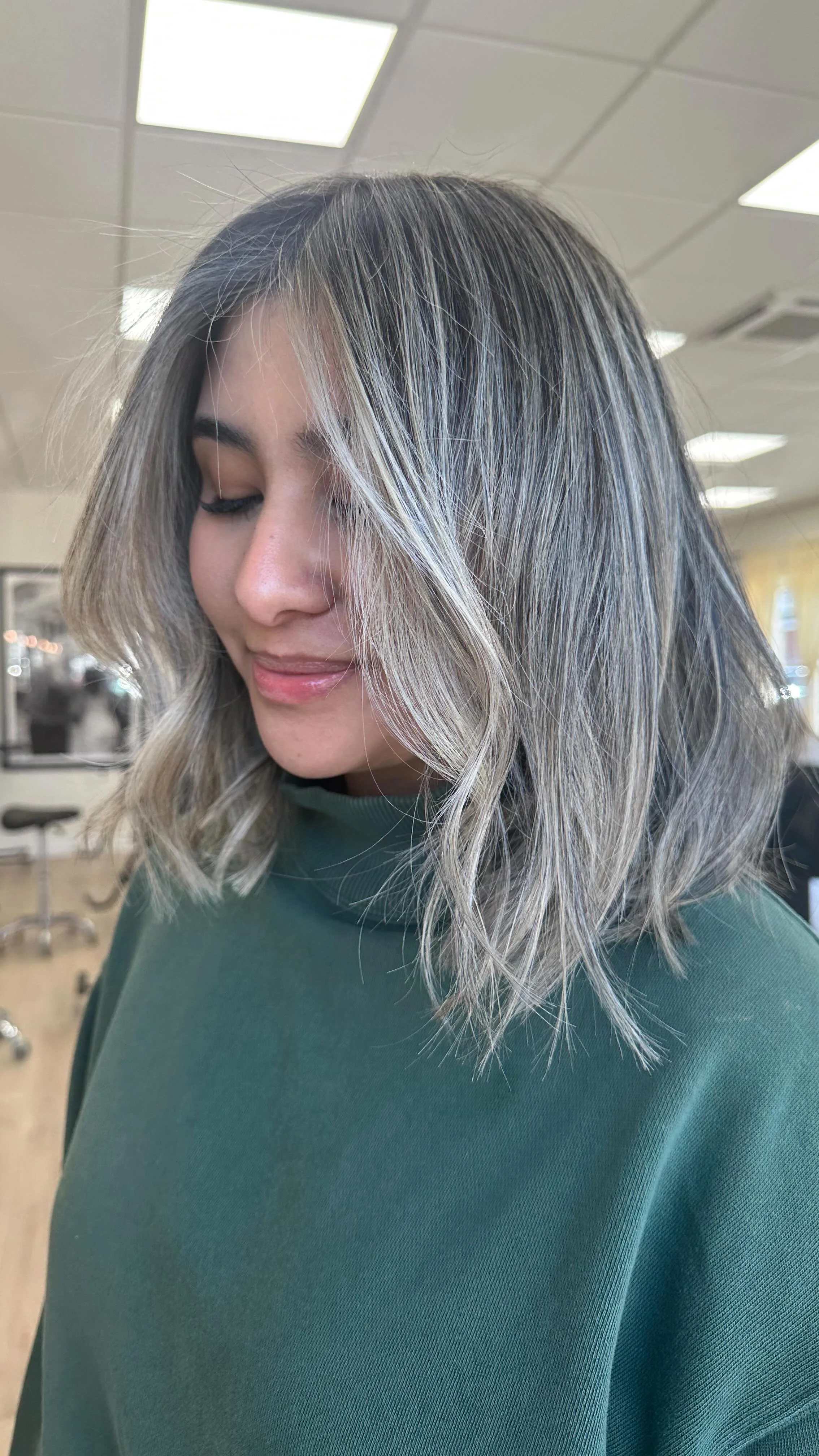 A modern, low maintenance approach to blending gray hair for a softer, more natural grow-out without harsh lines or frequent touch ups.